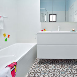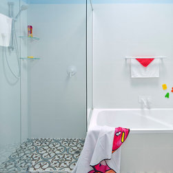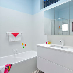 After the decision was made to remove the door, we were able to re-frame the stain-glass duck so that a new bathroom could have its own fun quirk and let an abundance of bathroom light filter into the lounge room. Consistent with the rest of the home’s palette, we were able to add bold interest to the floor, matching it with a calming blue pastel up high. A crisp white centre consisting of white tapware, vanity and fixtures really widened the room and created a blank canvas for pops of colour to be invited through children’s toys and linen, which further added life to the space. The only challenge remaining will be coaxing children out of the family fun bathroom each day!