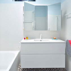 A room with dual access was ineffectively being used as a laundry, store room and family bathroom. We were given the task to relocate the laundry to another part of the home. This room was to become a fun bathroom for a growing family to use. The absence of a bathtub made bathing 2 small children practically impossible. The lack of functional storage also left much to be desired. A more functional layout also needed to be determined. A stained-glass door, featuring a playful duck pond, was one of few natural light sources available to the adjacent lounge room. However, access between the two rooms was not ideal for privacy nor maximisation of space. Our clients wanted to retain this original bespoke feature as a fun contribution to the bathroom.