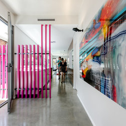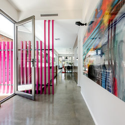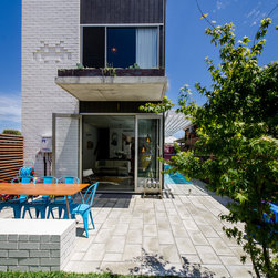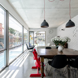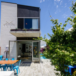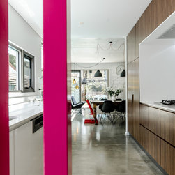 The design is a marriage of utilitarian functionalism with tongue-in-cheek playfulness. The planning of the building is simplistic and efficient. Materials selected are honest and expressed genuinely. The spaces address the light and the outdoor areas and each of the four bedrooms has its own unique urban aspect. A long lap-pool inhabits the space between the house and its neighbour and brings reflected diffuse light into the home and creates a sense of separation.