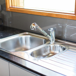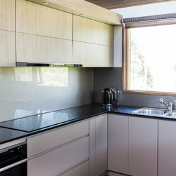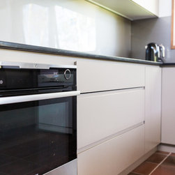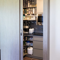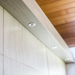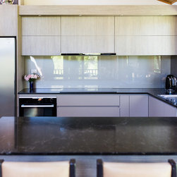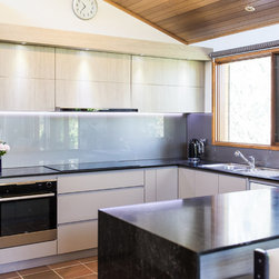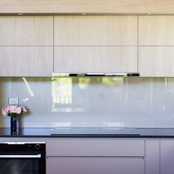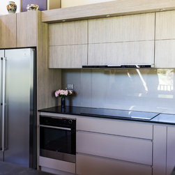 There were several design challenges in this project which were overcome by some clever solutions. For example, the high ceilings presented the need to hide the duct for the range hood so a bulkhead was created in the same finish as the overhead cabinetry - the perfect place for some feature down lights.