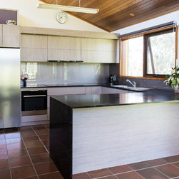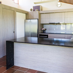 Two different yet complementary finishes were selected for the cabinetry. Polytec's 'Tessuto Milan' (Ravine) gives interest to the upper cabinetry while the lower cabinetry features Polytec 'Taupe'. The bench top is another stunning product from Caesarstone called 'Vanilla Noir'.