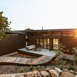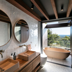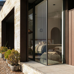 The residence integrates seamlessly with the natural landscape, embracing rugged sandstone, native flora, and expansive westward views. Corten standing seam cladding and natural materials were selected for their durability and aesthetic appeal, ensuring the home complements its environment. A standout feature of the design is the circular pool, perched dramatically on the sandstone cliff, creating a stunning focal point that enhances the connection to the escarpment's edge.