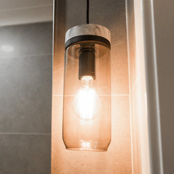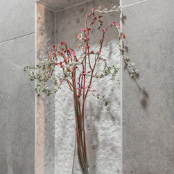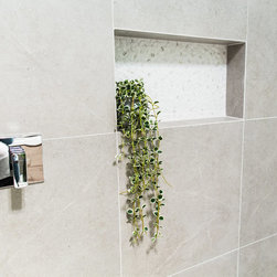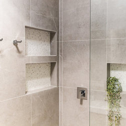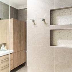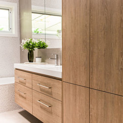 We also matched the ravine board of the client's selected vanity to make a linen cabinet that would line up with the bottom of the vanity as well as the top of the mirror. Our client's choice of tiles and fittings worked together perfectly with the wood-grain look of the cabinetry to help make the renovation look amazing!