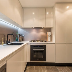 Glass Coloured Splash back | Modern Sleek Kitchen | Wine Storage