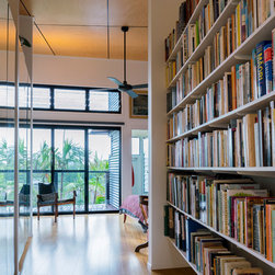 A continuous roof plane with plywood soffits link the internal and external living zones, providing a dramatic 'hat' to the house. Some internal walls, act only as partitions to further enhance the volume effect internally.