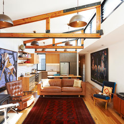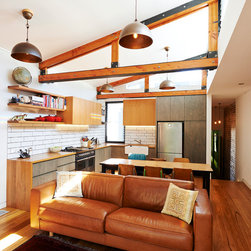 Glebe Park House involved salvaging a front room and a half from a crumbling semi all else was beyond repair. The subsequent rebuild on a tight site allowed for a super compact 4 bedroom, 3 bathroom home with a basement and grand living spaces under an industrially trussed roof. The rebuild allowed a semi model to be re-imagined as a home to suit a growing family. The design opportunity allowed for the roof to lift up to the North, a main bedroom suite to be located on the rooftop and incised light wells to flood the ground floor bedrooms with light and cross ventilation.