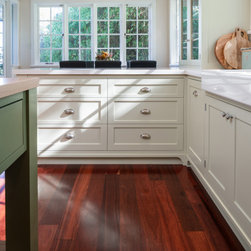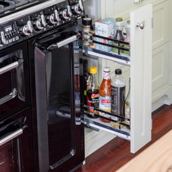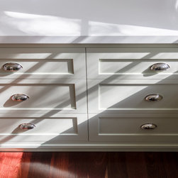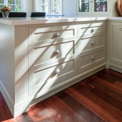Handles and knobs: Castella Decade (202.076.28) cup pulls Kennedy knobs (050.030.06) in polished nickel.