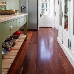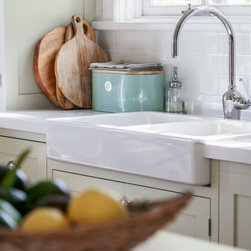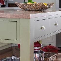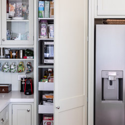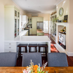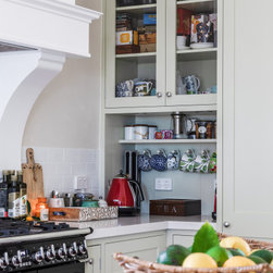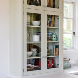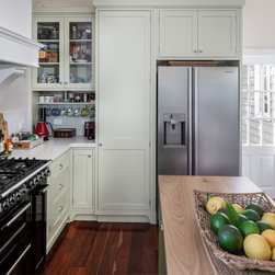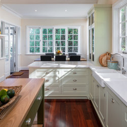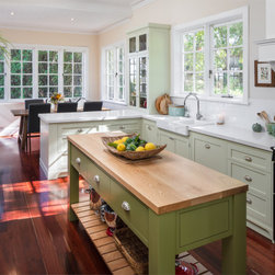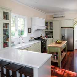 Doors: shaker with feature exposed hinges in satin lacquer to match Dulux Eaves and Dulux Tambo Tank (on island).
