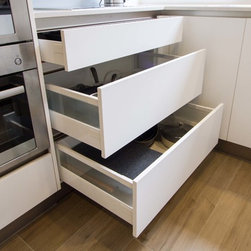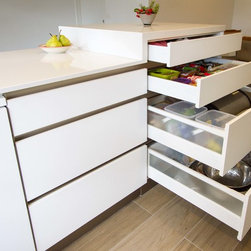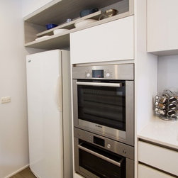 This kitchen was previously very run down, impractical and borderline unsafe. Our clever Designer, Daniel, came in and fashioned a whole new space for our clients and their 70s built home. With a new product fresh in his mind, Daniel used Polytec’s Legato laminate range to create a smooth, matt look that is elegantly touchable. The feature shelves above the fridge allow for display storage and visual interest.