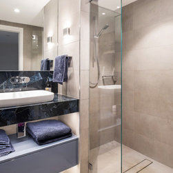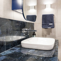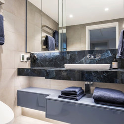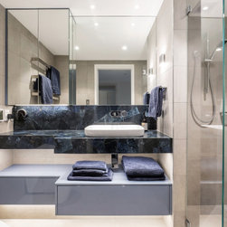 The luxurious feel of this bathroom is created by the elegant neutral colour used for the wall and floors, dramatically contrasted by the use of Caesarstone's exclusive Concetto range of hand-crafted, semi-precious stones. The use of Wedgewood blue cabinetry to further enhance the pale blue veining in the Dumortierite, balances the look.