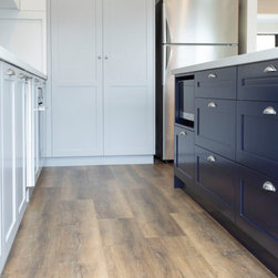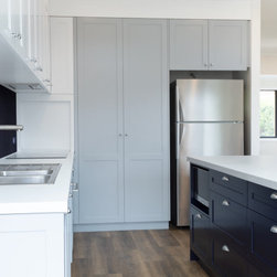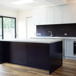 Busy family home. Navy, grey and white joinery on an oak floor.