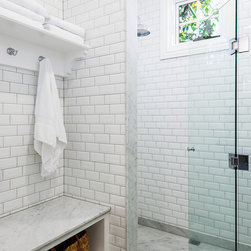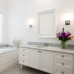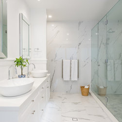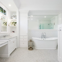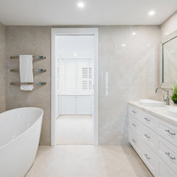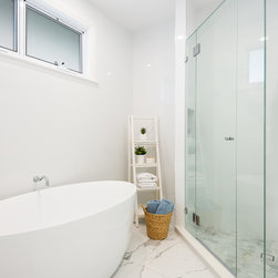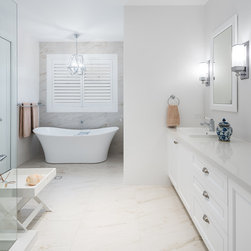 Polished travertine walls and floors. Freestanding bath with wall mounted tapware.