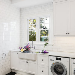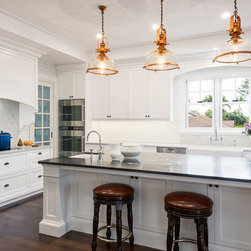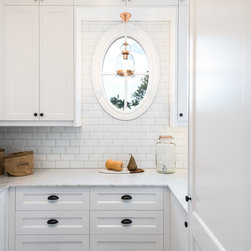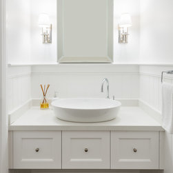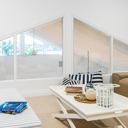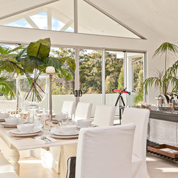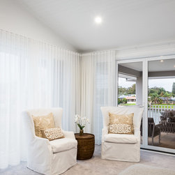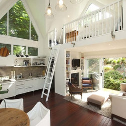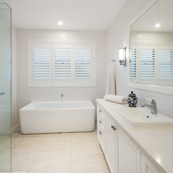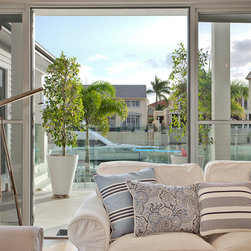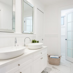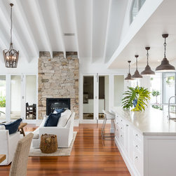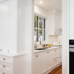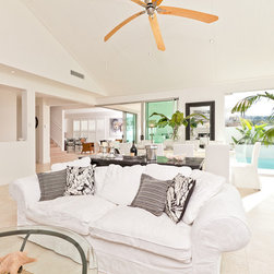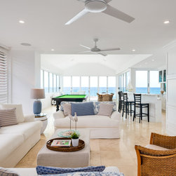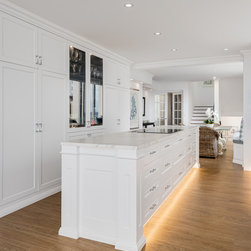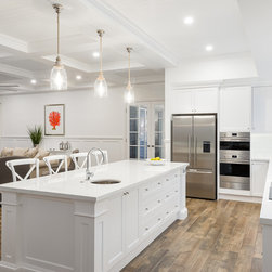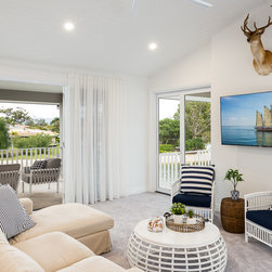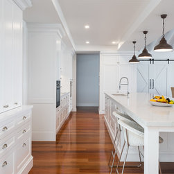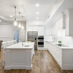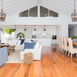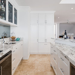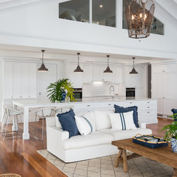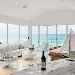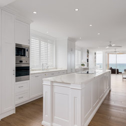 White Coast style kitchen in beachfront apartment. Porcelain benchtops.