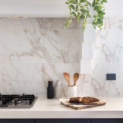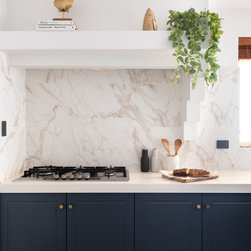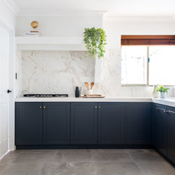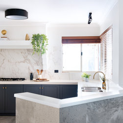 Our vision for the Kitchen was to create a classic look and to integrate the Rangehood mantle and existing facebrick wall. This was achieved through the midnight coloured cabinetry, gold accents to tapware and cabinet handles, the timeless marble-look, large format splashback tiles and cladding the facebrick wall.
