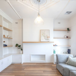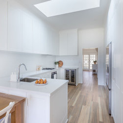 We started by improving the overall workflow functionality and creating further storage areas in the kitchen, dining, and lounge areas. In the kitchen, we strategically repositioned and widened the access door and shifted an existing brick wall to expand its footprint. The new kitchen layout lets the light flow from the front entry to the rear of the home.