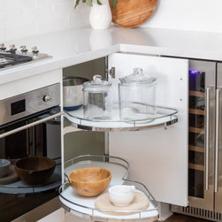 Throughout this Hamptons-style kitchen, we created ample functional storage with extended ceiling-height cabinetry. It spans nearly four meters and incorporates a variety of cabinetry elements with easy drawer access. It includes a French door fridge, a broom cupboard, two Blum Space towers, an integrated bin drawer and a Hafele Le Mans corner unit. In addition, the dining bench seat has top-hinged doors for both seating and storage.