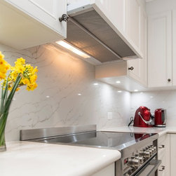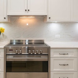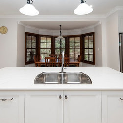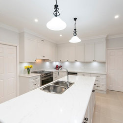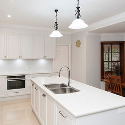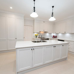 Contributing to this kitchen's beautiful traditional looks, are the shaker-style doors, elaborate handles, and bull-nose edging on the marble-look benchtop, all harmonising with the lovely traditional pendant lights over the island.