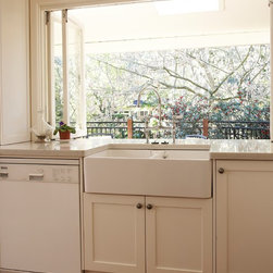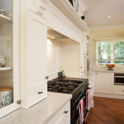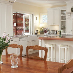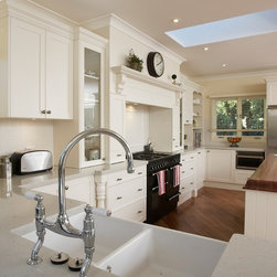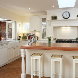 This beautiful traditional style kitchen is an exercise in good taste and professional design. The proud owner is assured many years of enjoyment, not only because of the timeless look, but also because of the quality of craftmanship and materials used, and thoughtful expert design. The chimney style treatment of the cooker and rangehood, focus the look and anchor it firmly in a traditional style, whilst the butler sink, timber benchtop, corbels and other fancy trims, complete the look. The bifold windows with the extended benchtop to the outside area is a