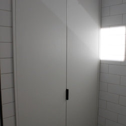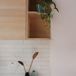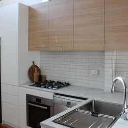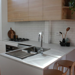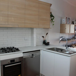 A perfect upgrade for this Northcote kitchen. Overheads made in Nikpol"'s Colour board "Light Ferrara Oak". Lower cabinetry and pantry made in colour board "Premium White". Bench tops in laminate "White Cement".