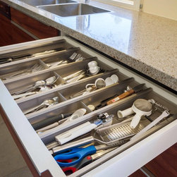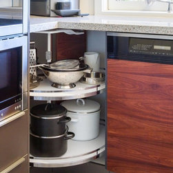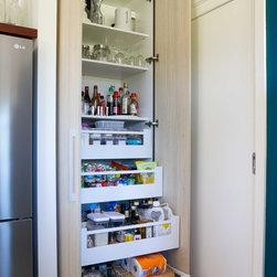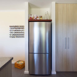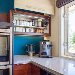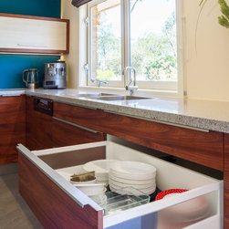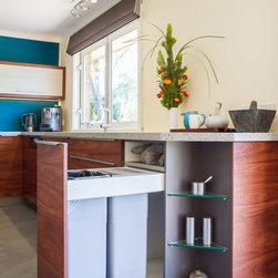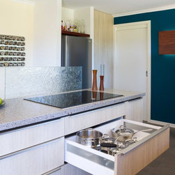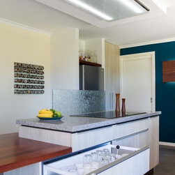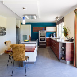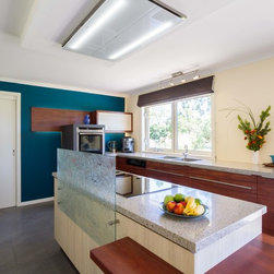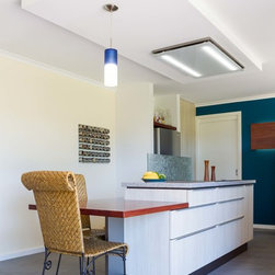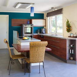 A standard 90s, G shape kitchen with painted timber doors has been transformed this week into something contemporary with a touch of eclectic charm. The bold blue/green wall colour is the perfect backdrop to the timber look doors bringing the space to life. Changing the footprint also meant that a meals area could be added to the end of the island.