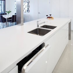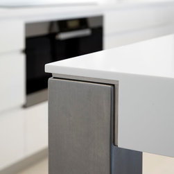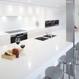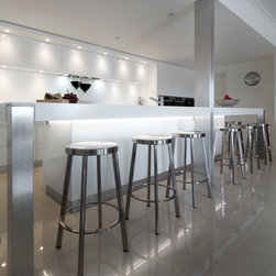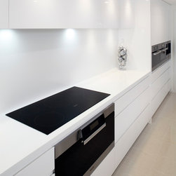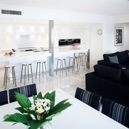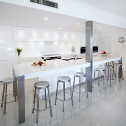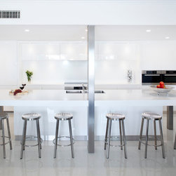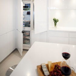 This modern kitchen design is anything but your standard white gloss kitchen. The brief was to transform a small dark, enclosed kitchen with minimal storage, into a bright and large entertaining space. Photos by Eliot Cohen