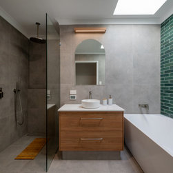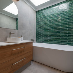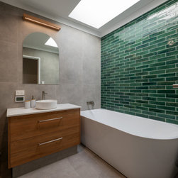 Large recessed skylight Green subway tiles and tiling, Arch mirror , custom made vanity and large semi freestanding bath.