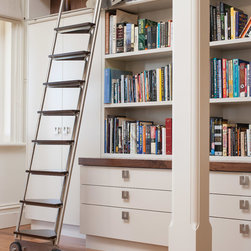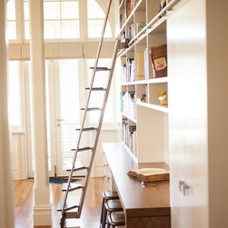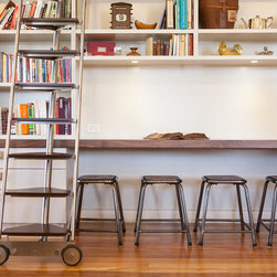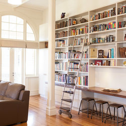 Exquisite home library with study desk. Built within the re-purposed Libcombe Hospital luxury residences. An impressively tall federation room allows for an equally impressive tall book case. Higher shelves are accessed by a rolling library ladder with stainless steel frame and timber treads.