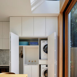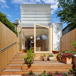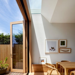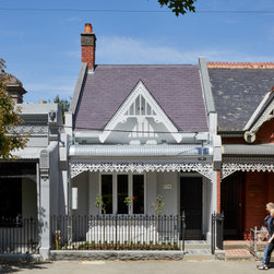 The result is a subtle renovation almost invisible from the street yet dramatic in its expressive qualities. An oblique view from the northwest reveals the playful zigzag of the new roof, the rippling metal hood. This is a form-making exercise that connects old to new as well as establishing spatial drama in what might otherwise have been utilitarian rooms upstairs. A simple palette of Australian hardwood timbers and white surfaces are complimented by tactile splashes of brass and rich moments of colour that reveal themselves from behind closed doors.