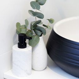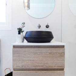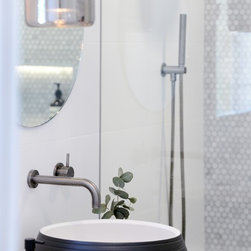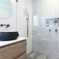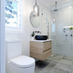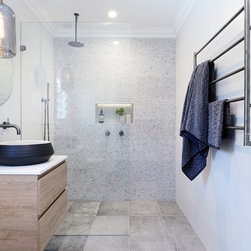 Feature tapware combined with cararra marble penny rounds create an enduring contemporary look which should stand the test of time in this guest bathroom. Simple, fresh and elegant was the brief with luxe details such as under floor heating and heated towel rails to make guests feel really at home. Feature lighting always takes a design to another level and the different combinations of light in this room are the icing on the cake.