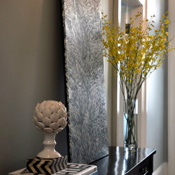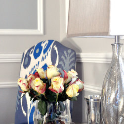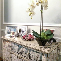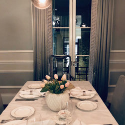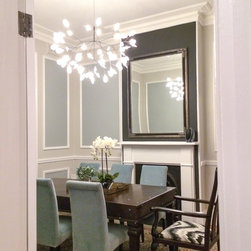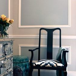 New cornices, chair rails and wall mouldings were installed, which set off to perfection the painted Georgian silver blue panels. The dark chocolate floors are an ideal backdrop for the metallic and mirrored finishes, indulgent textures, velvet upholstery and soft furnishings.