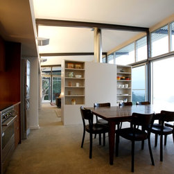 The house stretches along the contours of the site, and enables every room to have a view. Internal finishes have been deliberately selected for durability and to give the spaces a pared back, almost industrial quality, that compliments the exposed steel structure of the building.