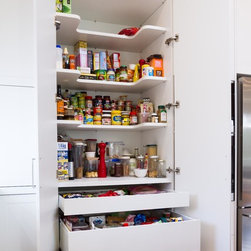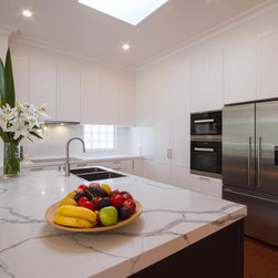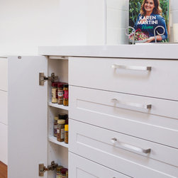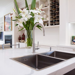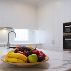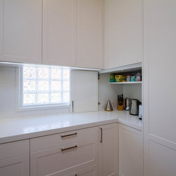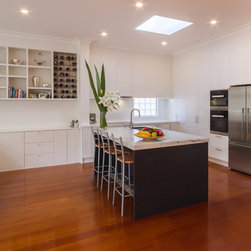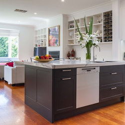 A simple take on the Modern Traditional kitchen style that features shaker doors and handle-less overhead cabinets. The change made to the layout allows for a more open flow to the space and easier access to the additional cabinets in the lounge room. Our clients were keen to achieve a very specific colour on the island cabinetry so after trying many different samples Designer, Peter Schelfhout, was able to find just the right one!