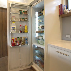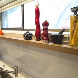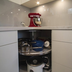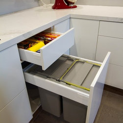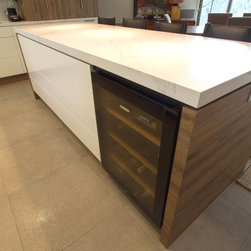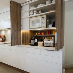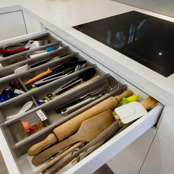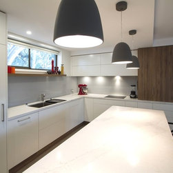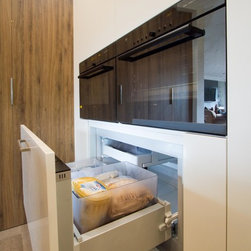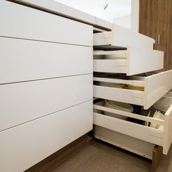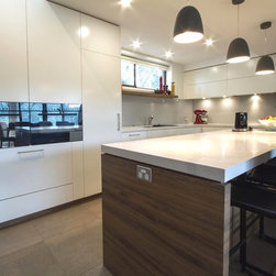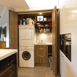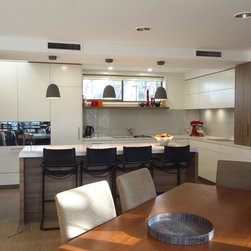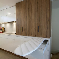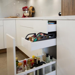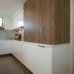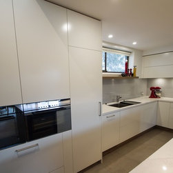 This house was a recent purchase for our clients who wanted to make it their own from the time they moved in. Their new kitchen includes a European laundry on the left with an extra sink allowing the space to double as a mini-butler’s pantry. The drawers are handless with the Blum Servo-drive mechanism allowing them to open with a touch and soft close when finished. This whole space is clean, crisp and streamlined with a little added character and warmth through the timber laminate feature panels.