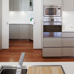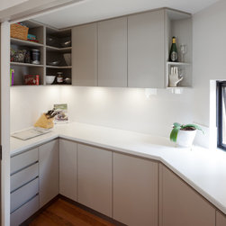 Kitchen and walk-in pantry. No handles/knobs.