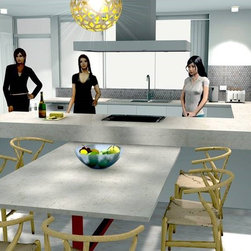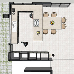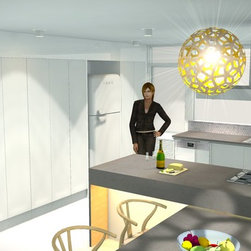 Concept design for kitchen renovation, removing one wall between lounge and kitchen to create a large integrated dining area for informal dining and entertaining.