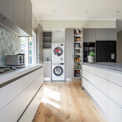 A laundry area is cleverly hidden behind bi-fold doors, next to a generous pantry, wall-oven tower and sleek 4-door fridge, creating an almost singular vertical length.
