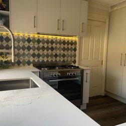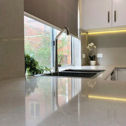 Beautiful Caesarstone benchtop and splashback with undermount stainless steel sink in our Glenwood kitchen renovation project.