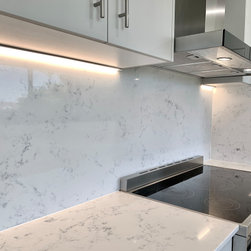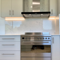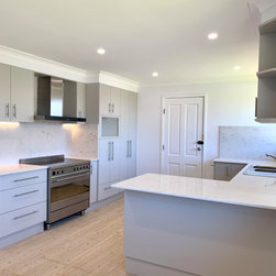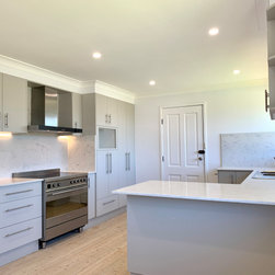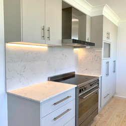New downlights were installed and under-cabinet LED strip lighting to enhance the stone splash-back creating a beautiful feature. The walls, bulkhead, new cornice and ceiling were painted white to complete this contemporary kitchen.