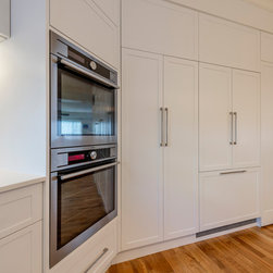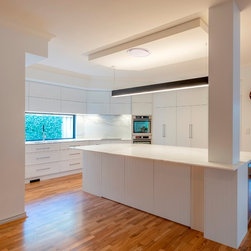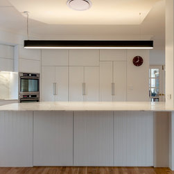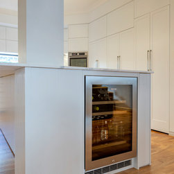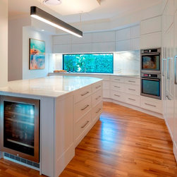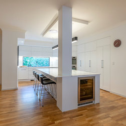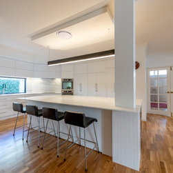 Taking out the return bench top and creating a large centre island to extend to the new boxed in pillar,floor to ceiling cabinets with crisp white doors, also incorporating the walk in hidden pantry which has given it a clean crisp architectural line.