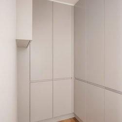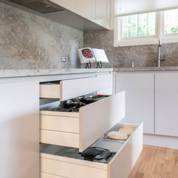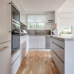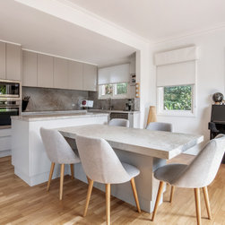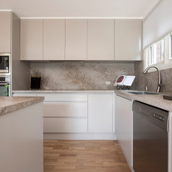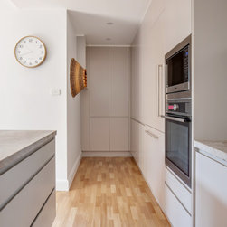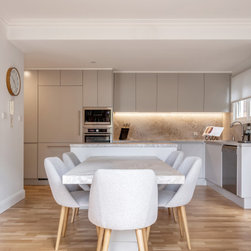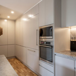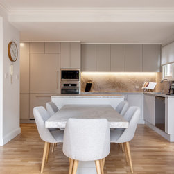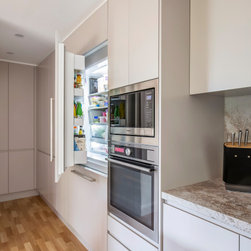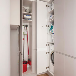 Clean lines, minimal use of handles and a fully built-in design leave this kitchen wanting for nothing. Everything has a home - from the washing machine & dryer, to cleaning items, pantry, integrated fridge, and ergonomic placement of oven and microwave, make this kitchen a breeze to work in.