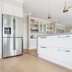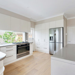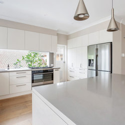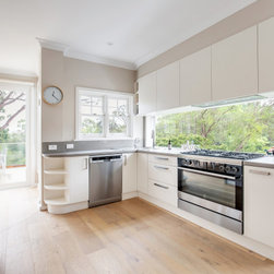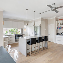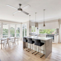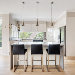 Good looks, functionality, ample storage, and plenty of special features, abound in this smart contemporary kitchen. The many windows and doors, as well as the window 'splashback', light colour palette and tall ceilings, all contribute to making the space super light and airy, making for a really spacious feel. The pendant lights and bar stools anchor the island and add that 'just right' touch of embellishment. The beautiful timber floors soften the look and resonate with the greenery outside.