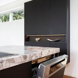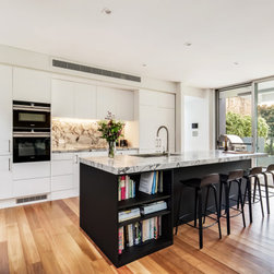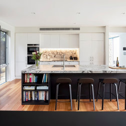 The open bookshelf at the island breaks up the monotone nicely and provides handy storage for cookbooks. Plenty of seating was a must, and allows those sitting at the island to not only interact with the cook, but also enjoy the outlook to the outdoor entertaining area, and almost feel part of it when the doors are open.