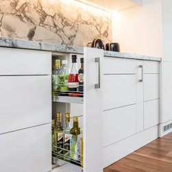 Practical elements have also been included, such as pull-out caddies for condiments, large integrated fridge, oven and microwave tower, and large double-bowl sink.