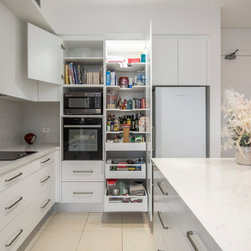 A microware/oven tower was the perfect choice for the space, and the pantry next to it boasts cut-out shelves and inner-drawers for ease of access.