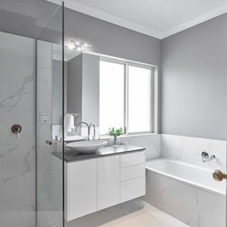 The brief was to update the bathroom to become a space of luxury, the clients were after a ‘transitional’ design, a blend between traditional and modern. Minimal wall tiling height was requested to add character using a feature paint colour above tiling. Easy cleaning fixtures and fittings and large format tiles were a must have as their original small decorative tiles were horrible to keep clean.