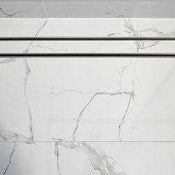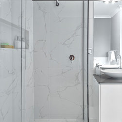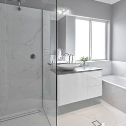 The colour palate for the Main bathroom was subtlety different using warm greys. The vanity benchtop was in 20mm Ceasarstone Raven stone, this was paired up with Carrara Venato 1200x600mm polished porcelain tiles.