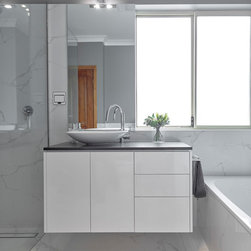 A custom vanity unit in 2Pac white gloss provided stylish storage. The plumbing was altered to allow for a wall hung vanity creating a larger sense of space.