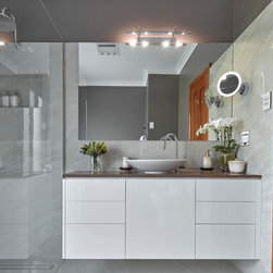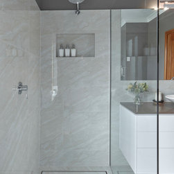 A custom vanity unit in 2Pac white gloss provided stylish storage. The plumbing was altered to allow for a wall hung vanity creating a larger sense of space.