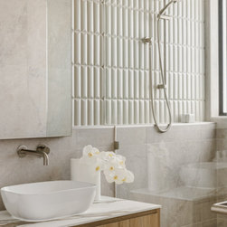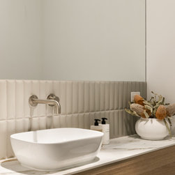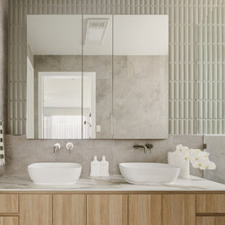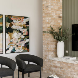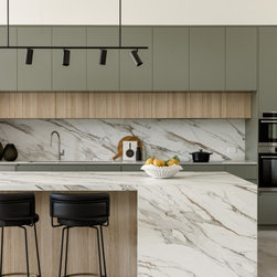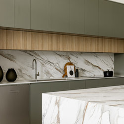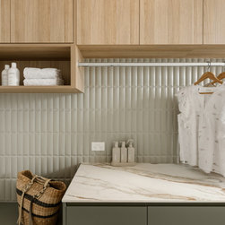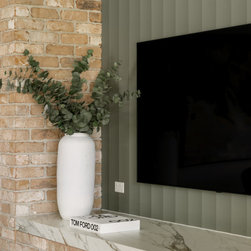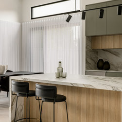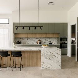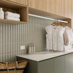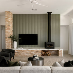 Internally, the design reflects a nature-inspired palette, incorporating olive green and timber look cabinetry, alongside recycled brick and polished porcelain stone. This choice of materials not only enhances the aesthetic appeal but also aligns with the sustainable ethos of the home, creating an inviting and harmonious environment for all who enter.