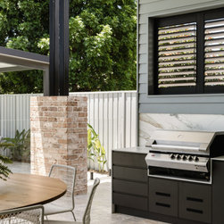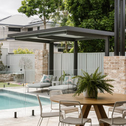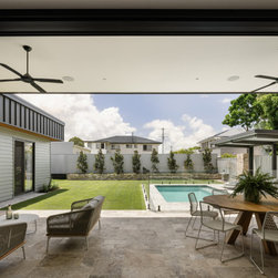 Inside, the 3.6m high ceilings are consistent throughout the main living areas, which encompass the kitchen, dining, living, media, guest area, and outdoor terrace. This design maximizes the feeling of spaciousness while enhancing airflow and environmental comfort. Large windows and doors, paired with overhead louvres, facilitate effective cross ventilation, ensuring a cool and enjoyable atmosphere year-round.